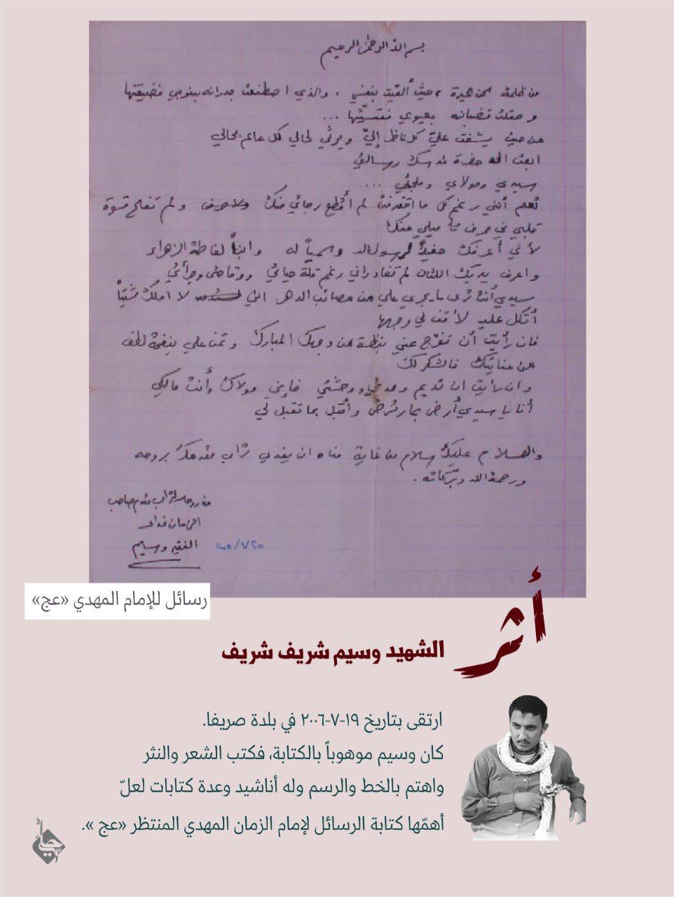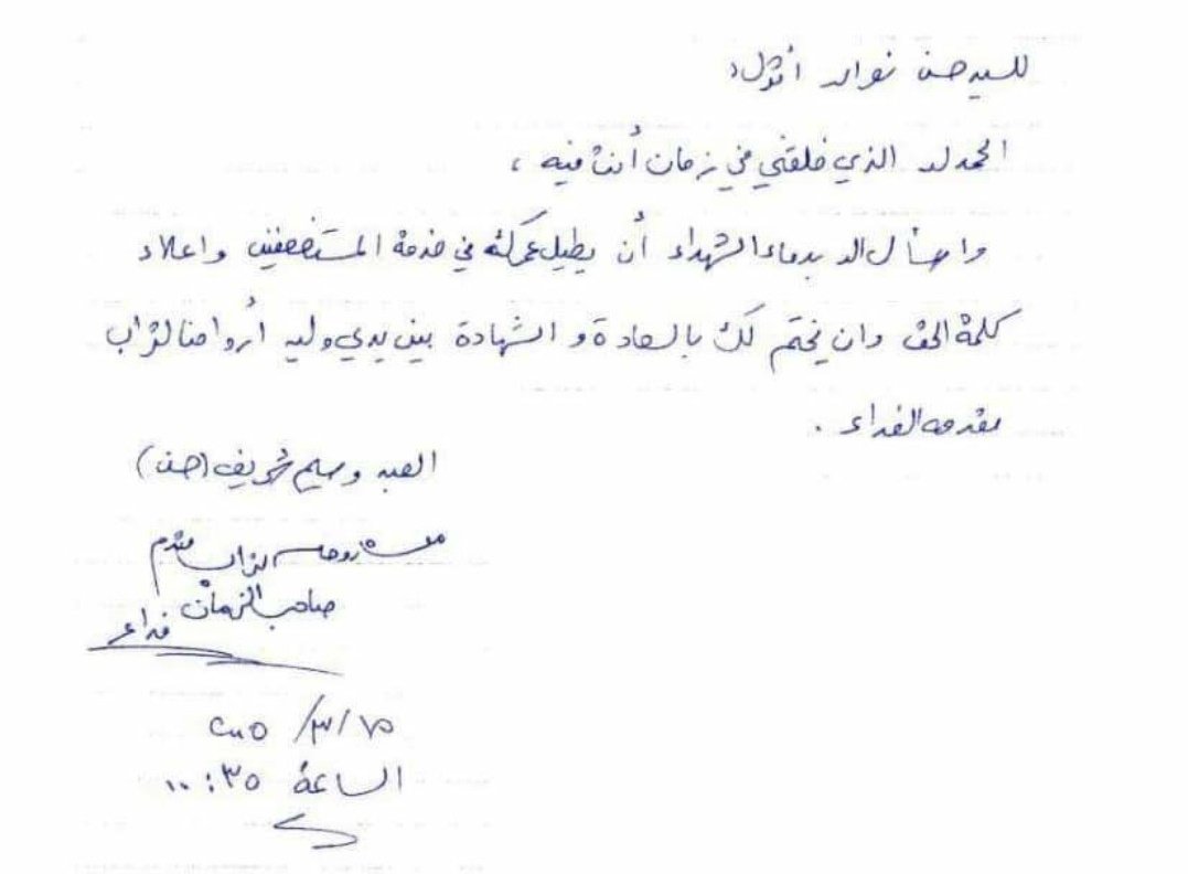 وكان توقيعه الخاص: من روحه لتراب مقدم صاحب الزّمان فداء.."